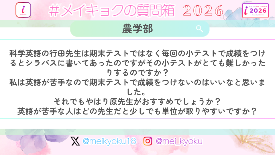 【農学部】科学英語の行田先生は期末テストではなく毎回の小テストで成績をつけるとシラバスに書いてあったのですがその小テストがとても難しかったりするのですか? 私は英語が苦手なので期末テストで成績をつけないのはいいなと思いました。 それでもやはり原先生がおすすめでしょうか? 英語が苦手な人はどの先生だと少しでも単位が取りやすいですか?