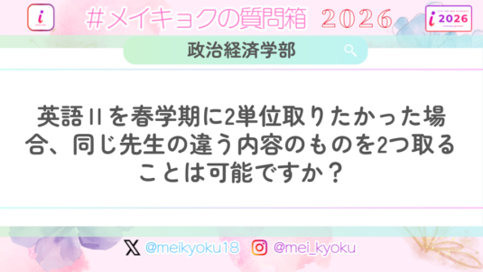 政治経済学部 【政治経済学部】英語Ⅱを春学期に2単位取りたかった場合、同じ先生の違う内容のものを2つ取ることは可能ですか?