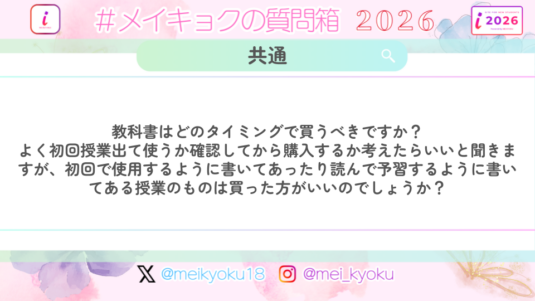 共通 【共通】教科書はどのタイミングで買うべきですか? よく初回授業出て使うか確認してから購入するか考えたらいいと聞きますが、初回で使用するように書いてあったり読んで予習するように書いてある授業のものは買った方がいいのでしょうか?