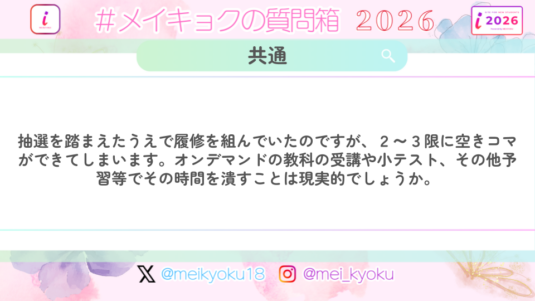 共通 【共通】抽選を踏まえたうえで履修を組んでいたのですが、2~3限に空きコマができてしまいます。オンデマンドの教科の受講や小テスト、その他予習等でその時間を潰すことは現実的でしょうか。
