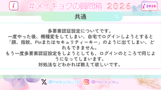 共通 【共通】多要素認証設定についてです。 一度やった後、機種変をしてしまい、自宅でログインしようとすると「顔、指紋、Pinまたはセキュリティーキー」のように出てしまい、どれもできません。 もう一度多要素認証設定をしようとしても、ログインのところで同じようになってしまいます。 対処法などわかれば教えて欲しいです。