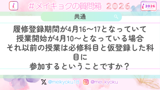 未分類 【共通】履修登録期間中の授業は、必修科目と仮登録した科目に参加するということですか?