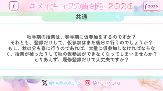 未分類 【共通】秋学期の授業は、春学期に仮参加をするのですか? それとも、登録だけして、仮参加はまた後日に行うのでしょうか? もし、秋の分も春に行うのであれば、大量に仮参加しなければならなく、授業が被ったりして秋の仮参加ができなくなってしまいませんか? とりあえず、履修登録だけで大丈夫ですか?