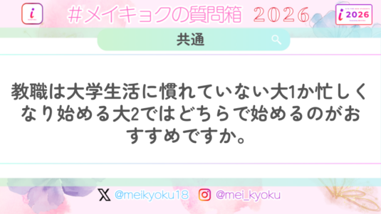 未分類 【共通】教職は大学生活に慣れていない大1か忙しくなり始める大2ではどちらで始めるのがおすすめですか。