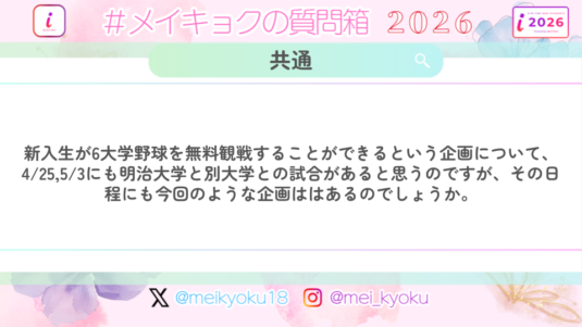 未分類 【共通】新入生が6大学野球を無料観戦することができるという企画について、4/25,5/3にも明治大学と別大学との試合があると思うのですが、その日程にも今回のような企画ははあるのでしょうか。