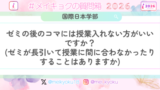 未分類 【共通】ゼミの後の時間は授業取らない方がいいですか? (ゼミが長引いて後の授業に間に合わなかったり)