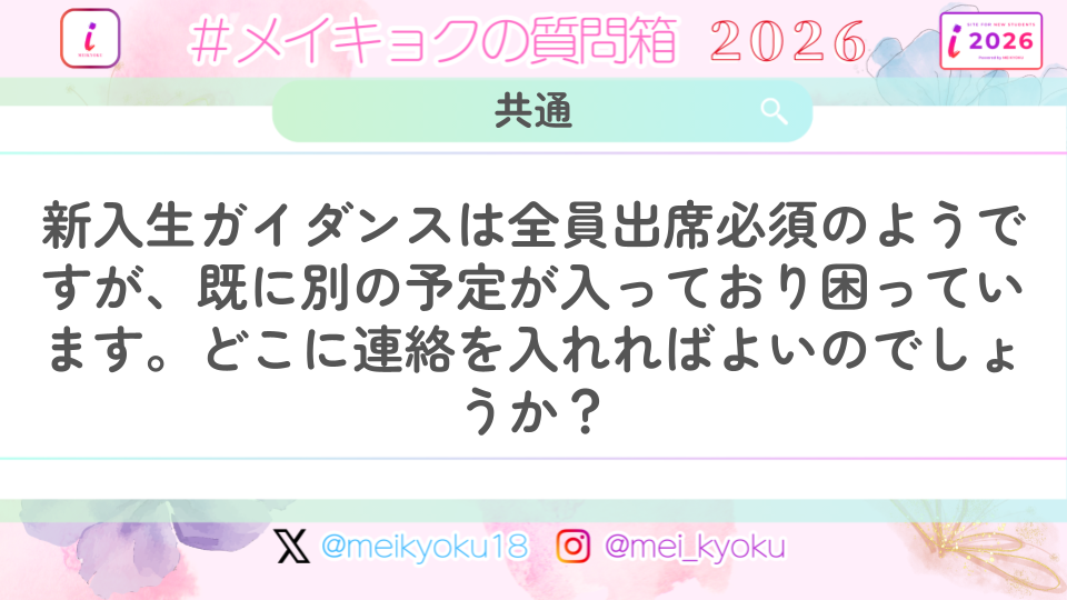 【共通】新入生ガイダンスは全員出席必須のようですが、既に別の予定が入っており困っています。どこに連絡を入れればよいのでしょうか?