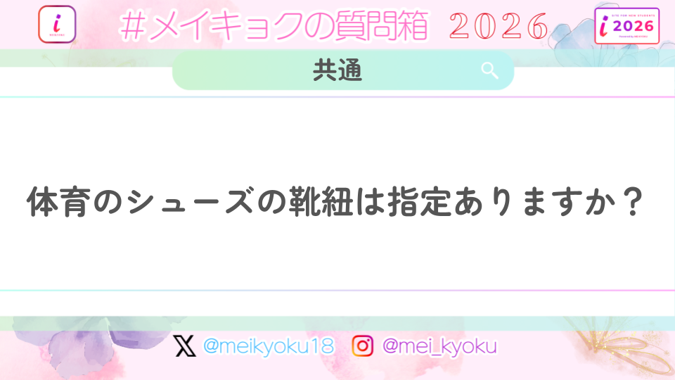 【共通】体育のシューズの靴紐は指定ありますか? 2026.04.14 共通 2026体育 Q【共通】体育のシューズの靴紐は指定ありますか?A 赤紐が指定なので、購入する必要があります。大体みんな明大マートで買っています!