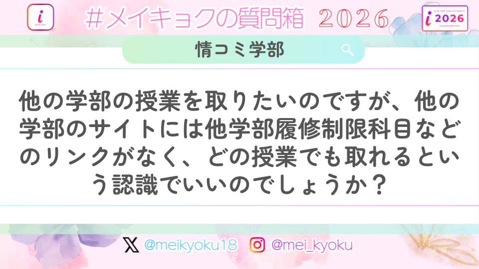 - Q【情コミ学部】他の学部の授業を取りたいのですが、他の学部のサイトには他学部履修制限科目などのリンクがなく、どの授業でも取れるという認識でいいのでしょうか?