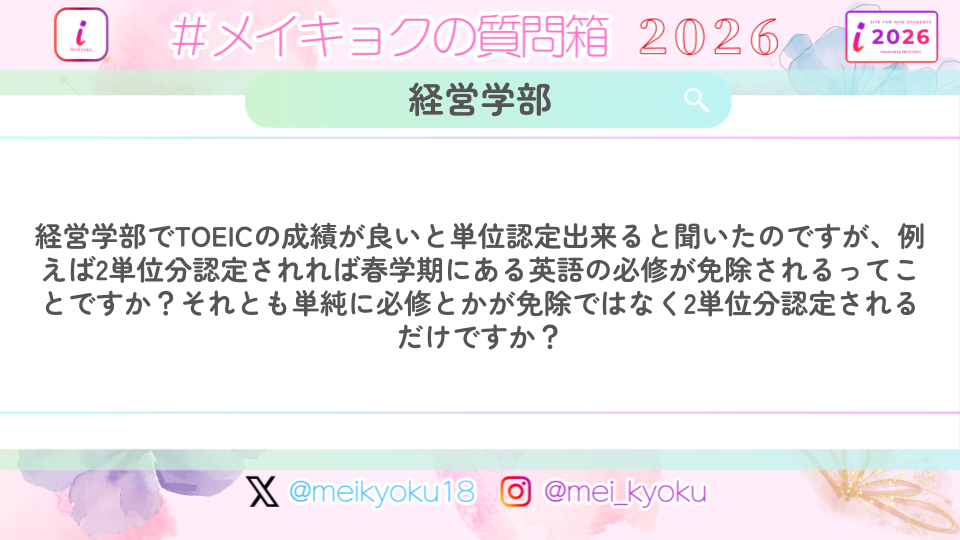 - Q【経営学部】経営学部でTOEICの成績が良いと単位認定出来ると聞いたのですが、例えば2単位分認定されれば春学期にある英語の必修が免除されるってことですか?それとも単純に必修とかが免除ではなく2単位分認定されるだけですか?