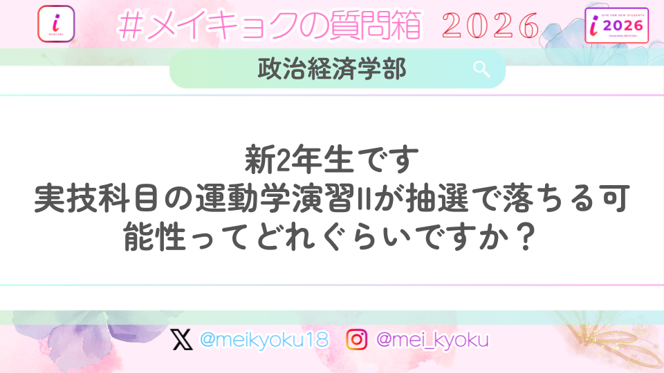 【政治経済学部】新2年生です 実技科目の運動学演習IIが抽選で落ちる可能性ってどれぐらいですか? 2026.04.06 政治経済学部 2026 Q実技科目の運動学演習Ⅱが抽選で落ちる可能性ってどれぐらいですか?A その科目の人気度によりますので、断定的な数字は出せません。