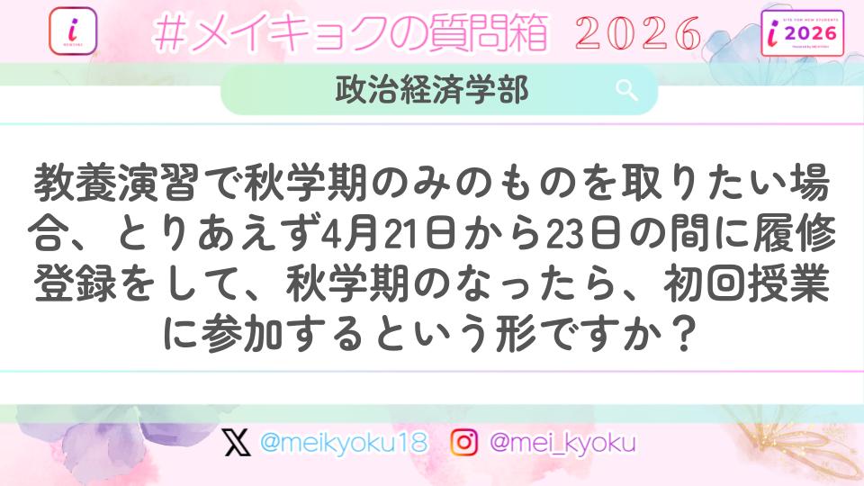 - Q【政治経済学部】教養演習で秋学期のみのものを取りたい場合、とりあえず4月21日から23日の間に履修登録をして、秋学期のなったら、初回授業に参加するという形ですか?