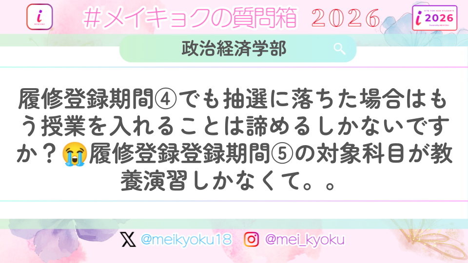 - Q【政治経済学部】履修登録期間④でも抽選に落ちた場合はもう授業を入れることは諦めるしかないですか?😭履修登録登録期間⑤の対象科目が教養演習しかなくて。。