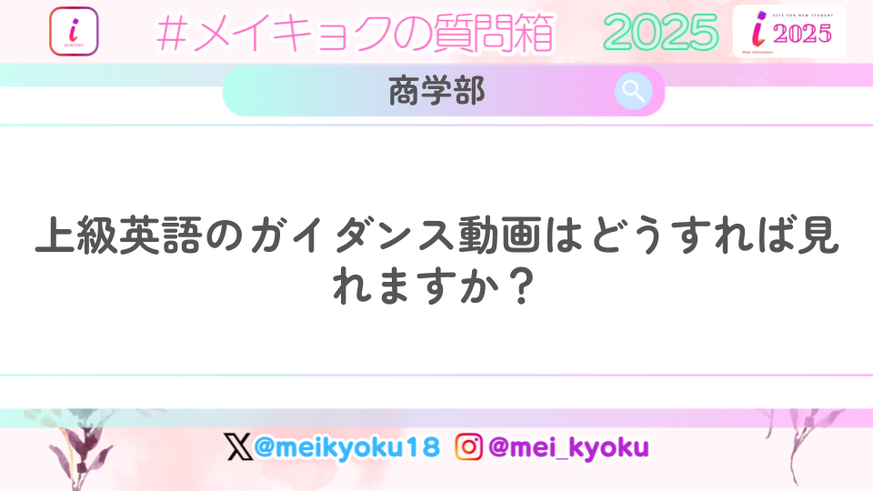 【商学部】上級英語のガイダンス動画はどうすれば見れますか? 2025.04.04 商学部 2025 情報古いかも 昨年度以前の回答のため、最新の情報とは異なる場合があります。 Q【商学部】上級英語のガイダンス動画はどうすれば見れますか?A Oh-o!Meijiの「グループ」のところに表示されているはずです!