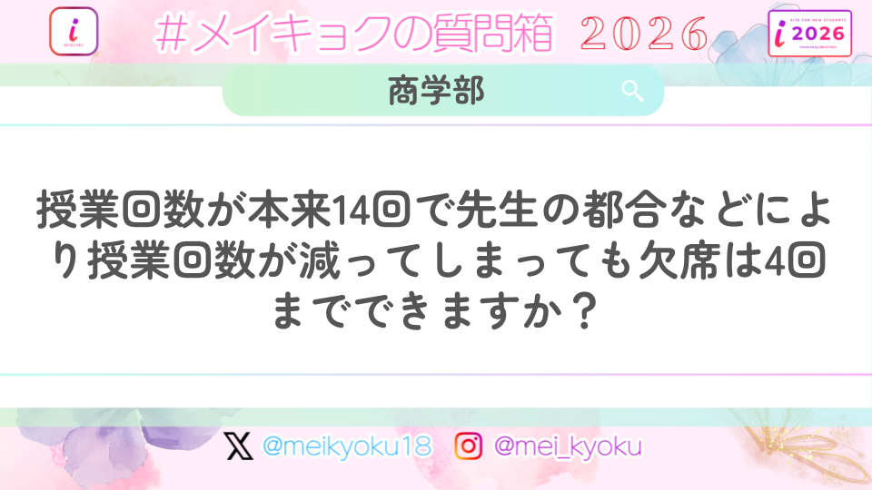 【商学部】授業回数が本来14回で先生の都合などにより授業回数が減ってしまっても欠席は4回までできますか? 2026.04.10 商学部 2026成績 Q【商学部】授業回数が本来14回で先生の都合などにより授業回数が減ってしまっても欠席は4回までできますか?A 基本的には可能です。出席の代わりとなるレポート等の出し忘れや、特別な案内がなければ大丈夫だと思います。