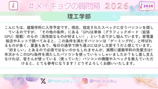 理工学部 【理工学部】建築学科に入学予定です。現在、指定されたスペックに合うパソコンを探しているのですが、学科の条件を満たすパソコンは毎日の通学で持ち運ぶには少し大変そうだと感じています。実際に建築学科の先輩方は1年次から条件を満たしたパソコンを使っていらっしゃいましたか?もし差し支えなければ、皆さんが使っている(使っていた)パソコンの機種やスペックを教えていただけると、とても参考になります!